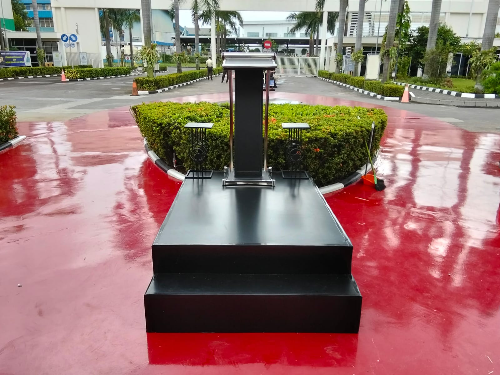 Oleh karena itu podium terbuat dari kayu jati lalu finishing dengan HPL dan juga terbuat dari stainless berkualitas yang tidak mudah karatan. Agar tampilan terlihat lebih mewah dan elegan.
